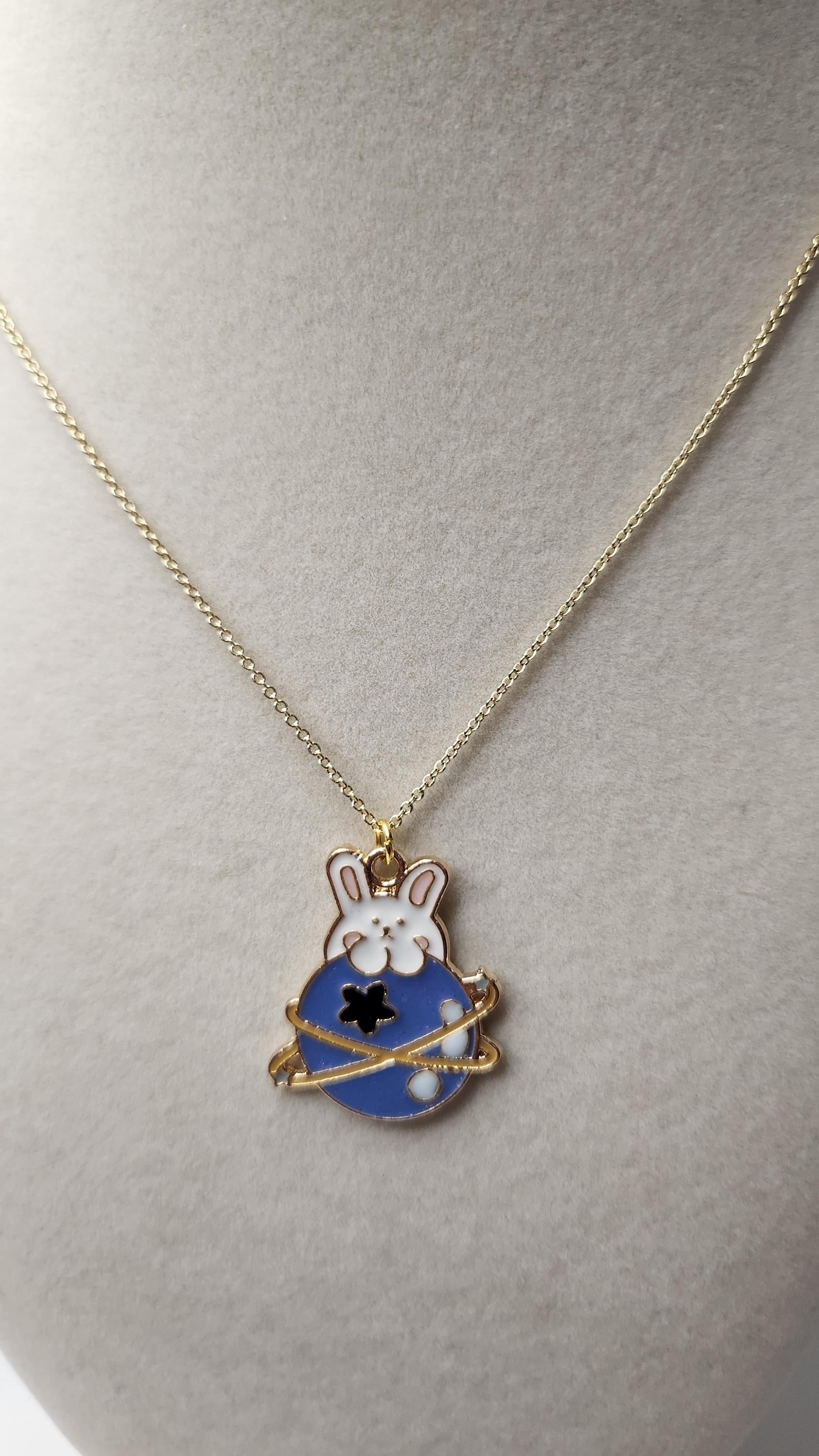 Handmade 14k gold plated galaxy bunny necklace with adjustable sizing.