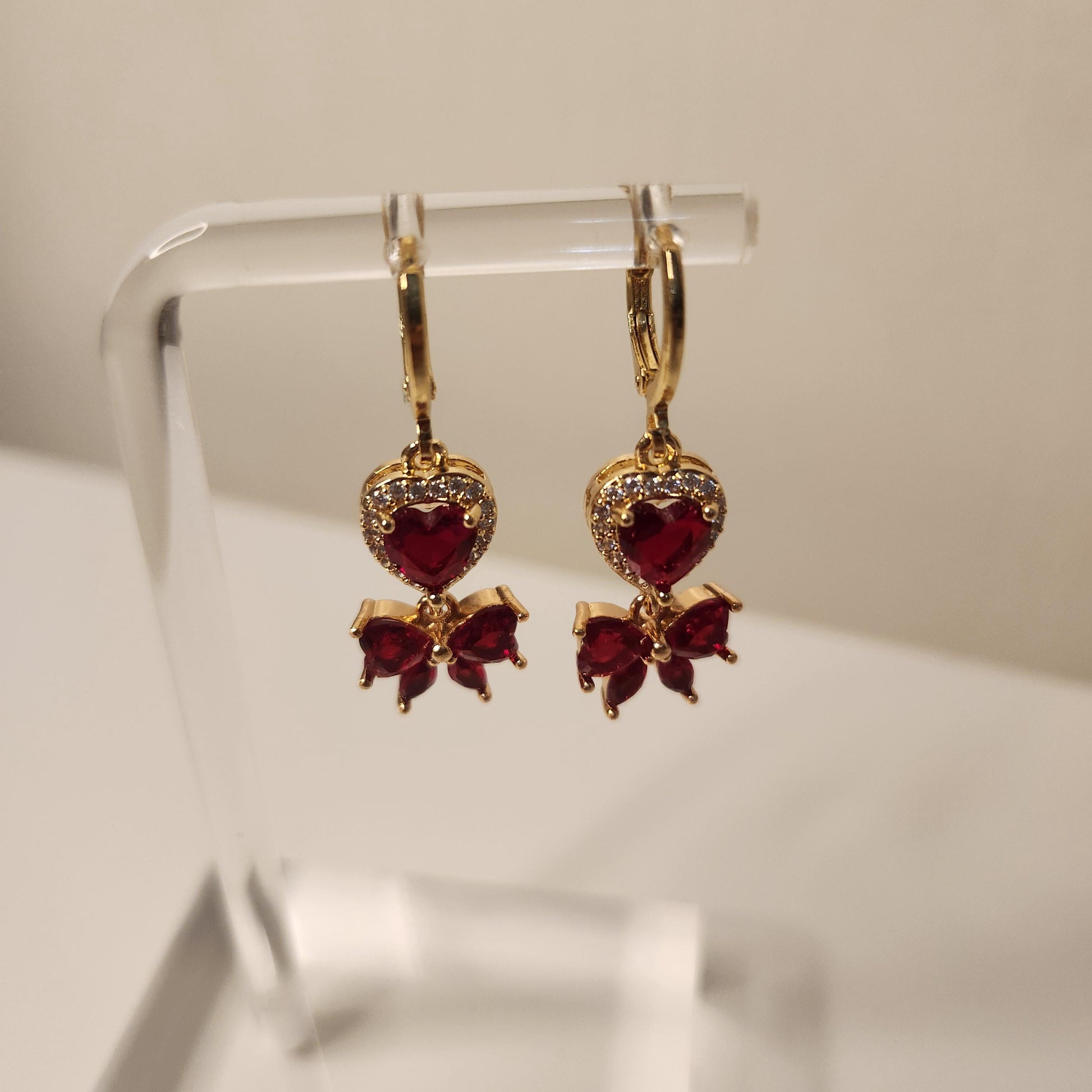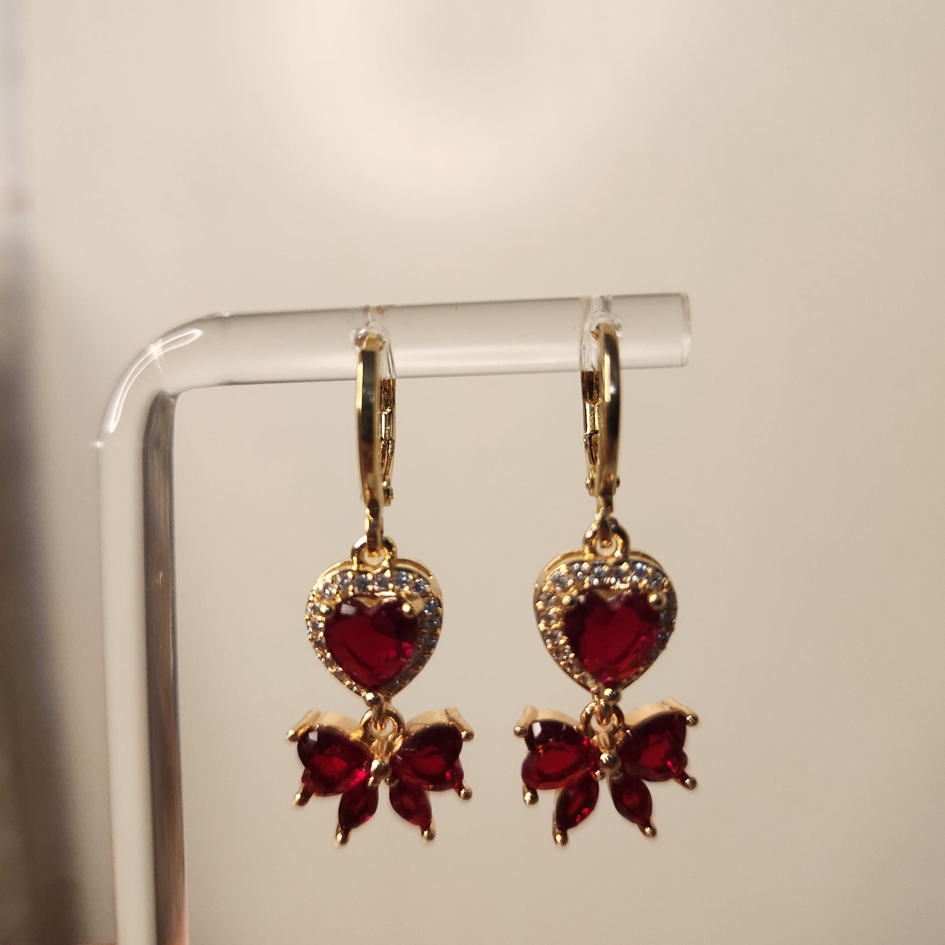 HANDMADE red heart and bow earrings with 14k gold plated huggie hoops